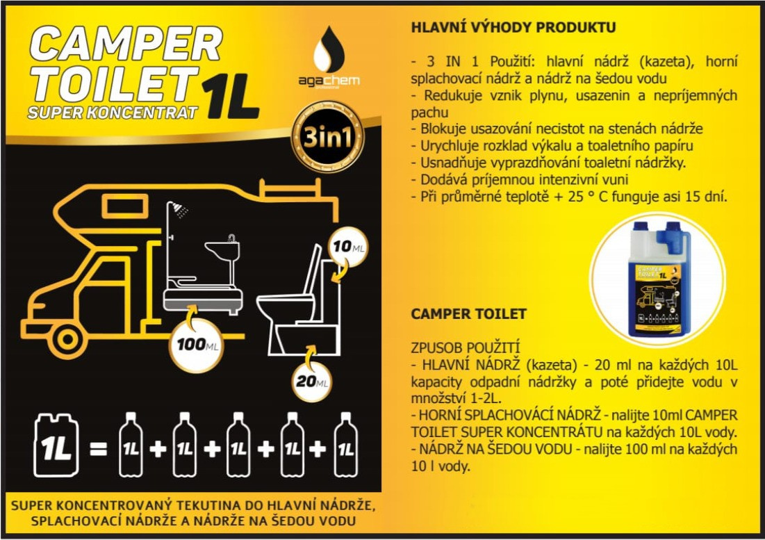 SUPER KONCENTRÁT – Univerzální prostředek pro mobilní a suché toalety. Vhodné pro použití do spodní nádrže, splachovací nádrže, odpadní nádrže pro šedou vodu. Vysoce koncentrovaný výrobek nahrazuje 5L balení.