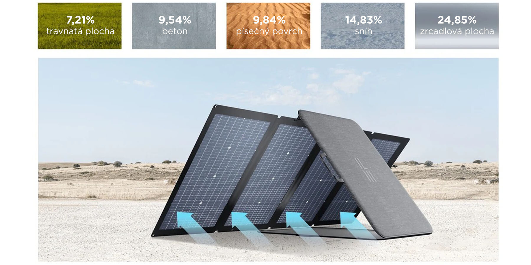 Oboustranný přenosný solární panel EcoFlow dosahuje na přední straně výkonu až 220 W a na zadní straně až 155 W pomocí odraženého světla. Právě zadní strana tak dokáže zachytit až o 25% více solární energie a ještě rychleji tak dobít bateriovou stanici. Kompaktní a skladný