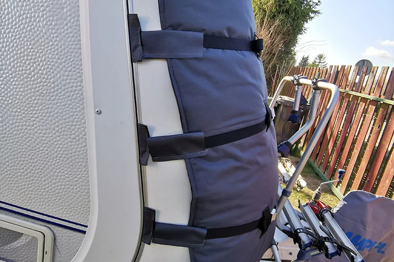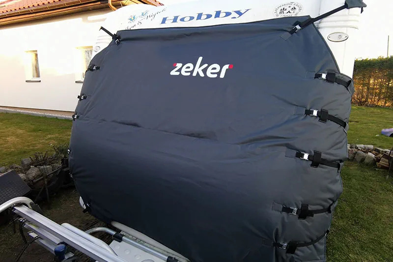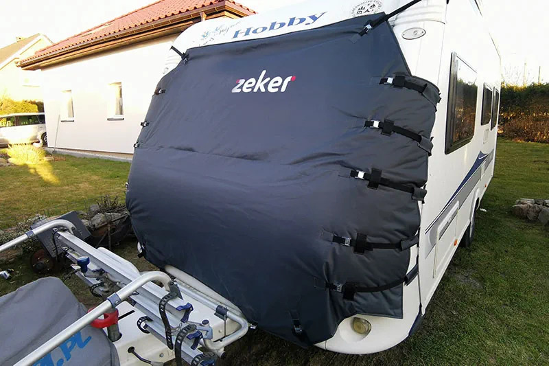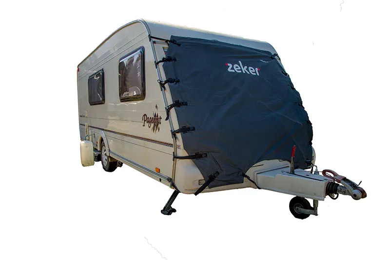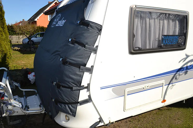 Ochranná plachta na karavan je vybavená na obou stranách lemovými spoji pro neinvazivní montáž krytu. Slouží jako tepelná izolace (letní i zimní) i jako ochrana před mechanickým poškozením odlétávajícími kamínky zpod kol tažného vozu.