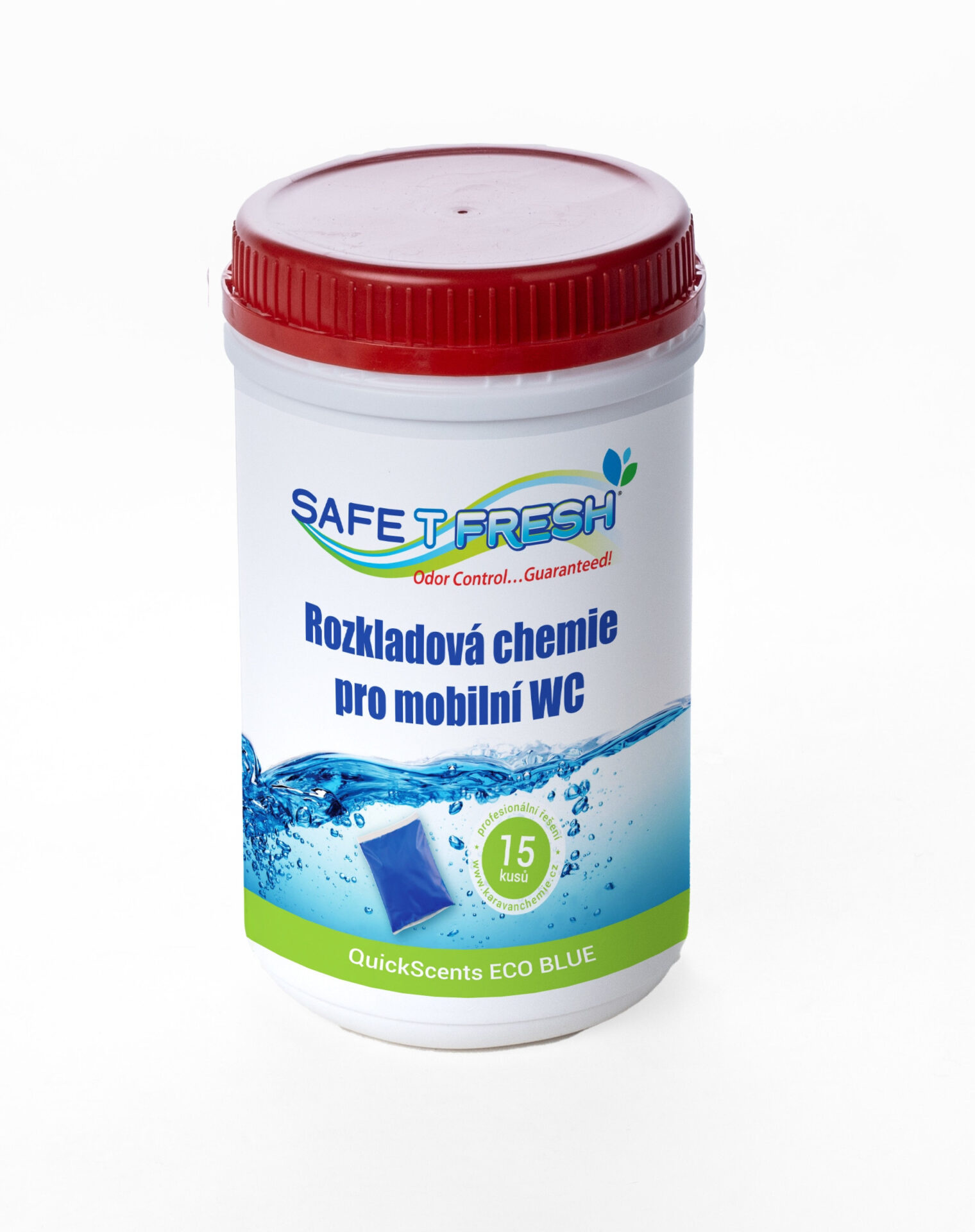 Quick Scents Eco Blue. Kapsle s chemicky přívětivějším složení k životnímu prostředí, ideální pro používání při běžné teplotě pro denní údržbu vaší toalety. Speciální patentovaná chemická formule Triple Molecular Technology pro uvolňování biocidů v odstupňovaných intervalech zajišťuje rozklad fekálií, vynikající ochranu proti zápachu toalety v uzavřených prostorech, zabraňuje usazování nečistot na stěnách nádrže, vytváří dlouhotrvající modrou barvu. Náš jedinečný vnější film se rychle rozpouští v kombinaci s měkkým, vysokým nebo nízkým pH i tvrdou vodou. Při použití slané vody budou kapsle Safe-T-Fresh fungovat na vyšší úrovni. Neobsahuje formaldehyd.