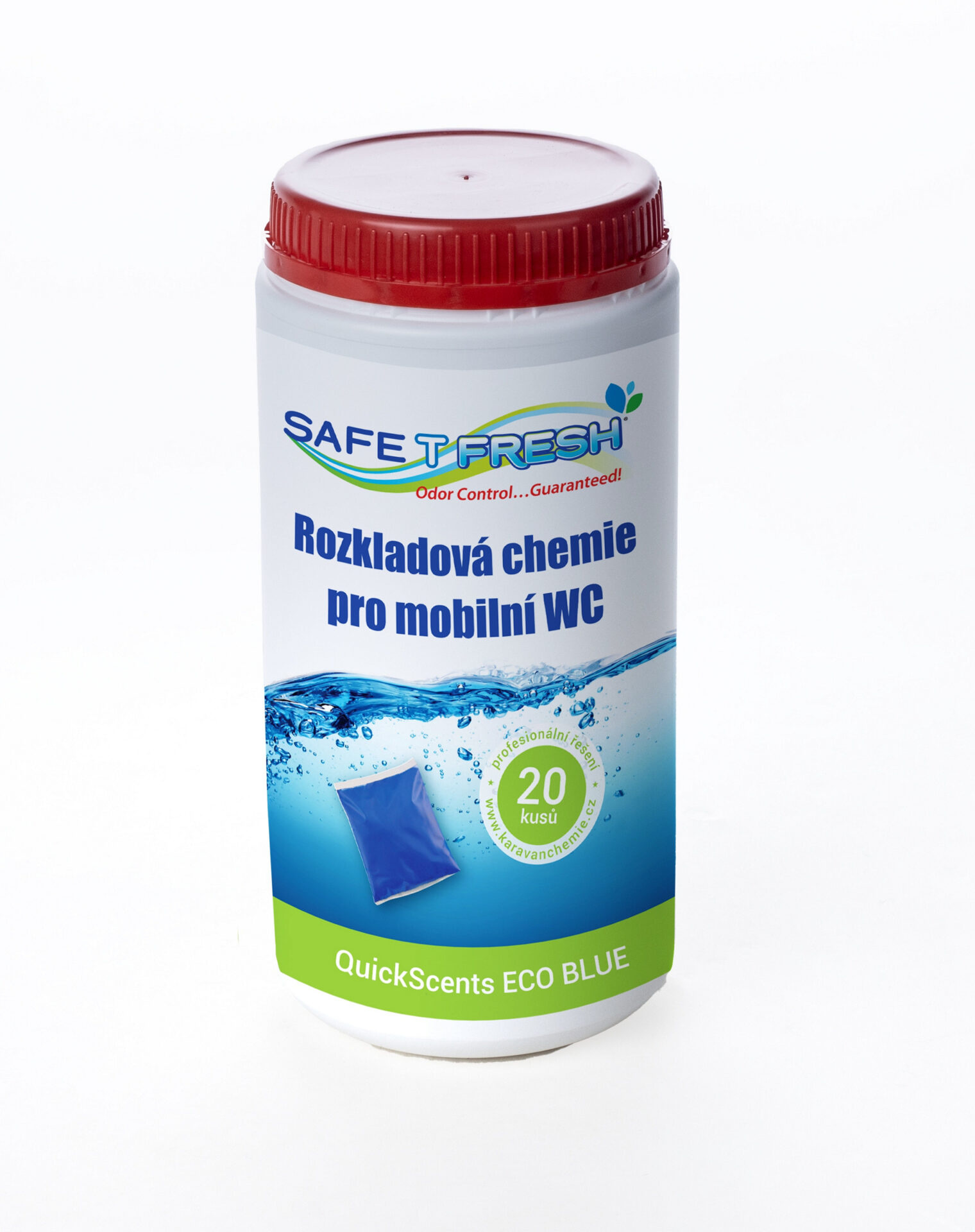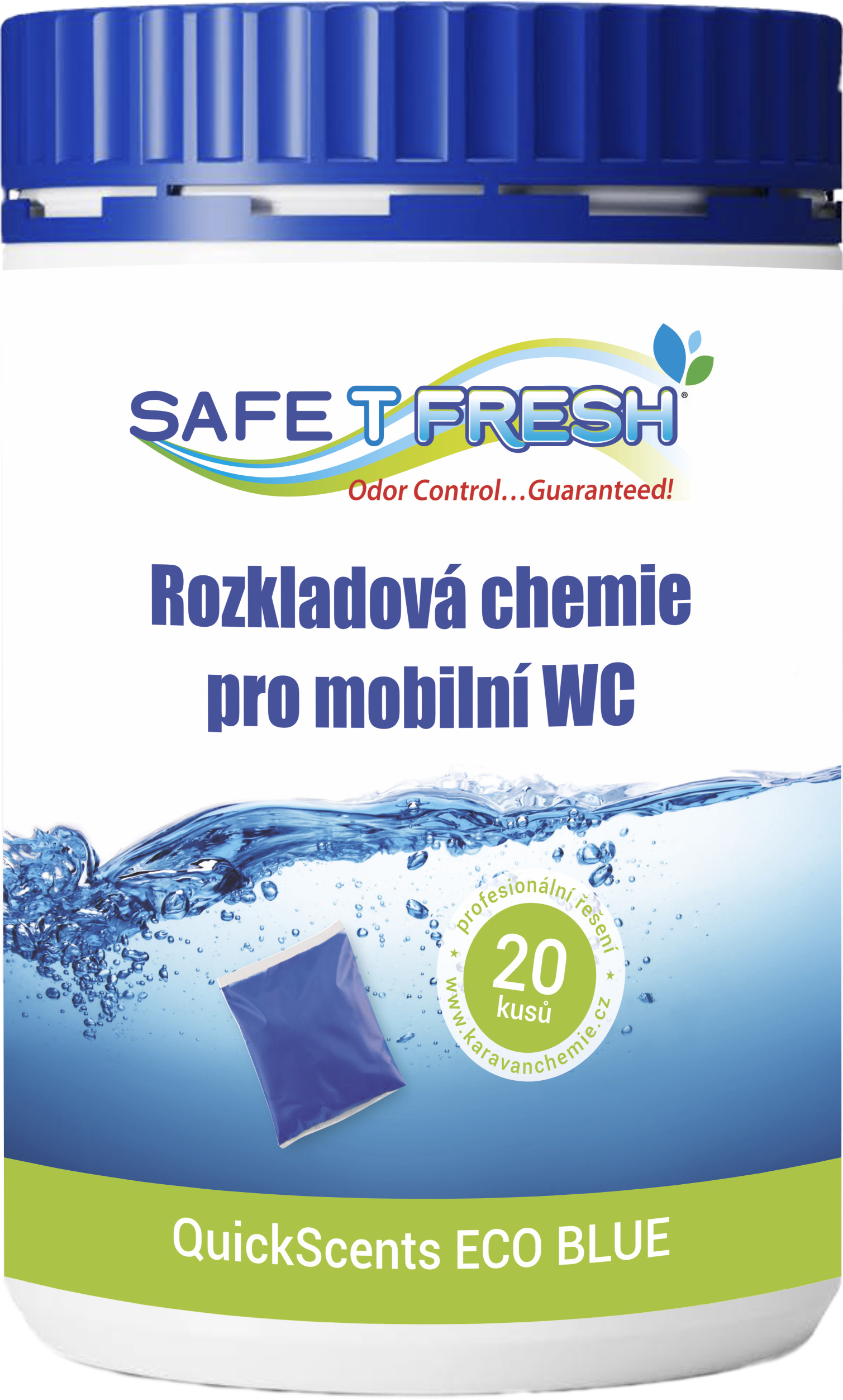 Quick Scents Eco Blue. Kapsle s chemicky přívětivějším složením k životnímu prostředí, ideální pro používání při běžné teplotě pro denní údržbu vaší toalety. Speciální patentovaná chemická formule Triple Molecular Technology pro uvolňování biocidů v odstupňovaných intervalech zajišťuje rozklad fekálií, vynikající ochranu proti zápachu toalety v uzavřených prostorech, zabraňuje usazování nečistot na stěnách nádrže, vytváří dlouhotrvající modrou barvu. Náš jedinečný vnější film se rychle rozpouští v kombinaci s měkkým, vysokým nebo nízkým pH i tvrdou vodou. Při použití slané vody budou kapsle Safe-T-Fresh fungovat na vyšší úrovni. Neobsahuje formaldehyd.