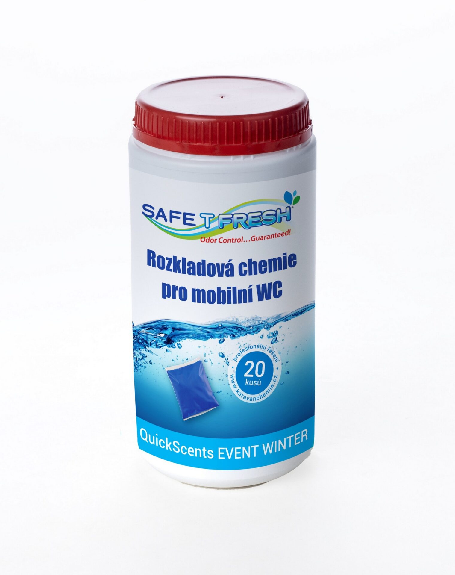 Quick Scents Event Winter, pro zimní období, kapsle s šumivým efektem při rozpouštění, v kombinaci se slaným roztokem ideální pro používání při nízkých teplotách pro denní údržbu vaší toalety. Speciální patentovaná chemická formule Triple Molecular Technology pro uvolňování biocidů v odstupňovaných intervalech zajišťuje rozklad fekálií, vynikající ochranu proti zápachu toalety v uzavřených prostorech, zabraňuje usazování nečistot na stěnách nádrže, vytváří dlouhotrvající modrou barvu. Náš jedinečný vnější film se rychle rozpouští v kombinaci s měkkým, vysokým nebo nízkým pH i tvrdou vodou. Při použití slané vody budou kapsle Safe-T-Fresh fungovat na vyšší úrovni. Neobsahuje formaldehyd.