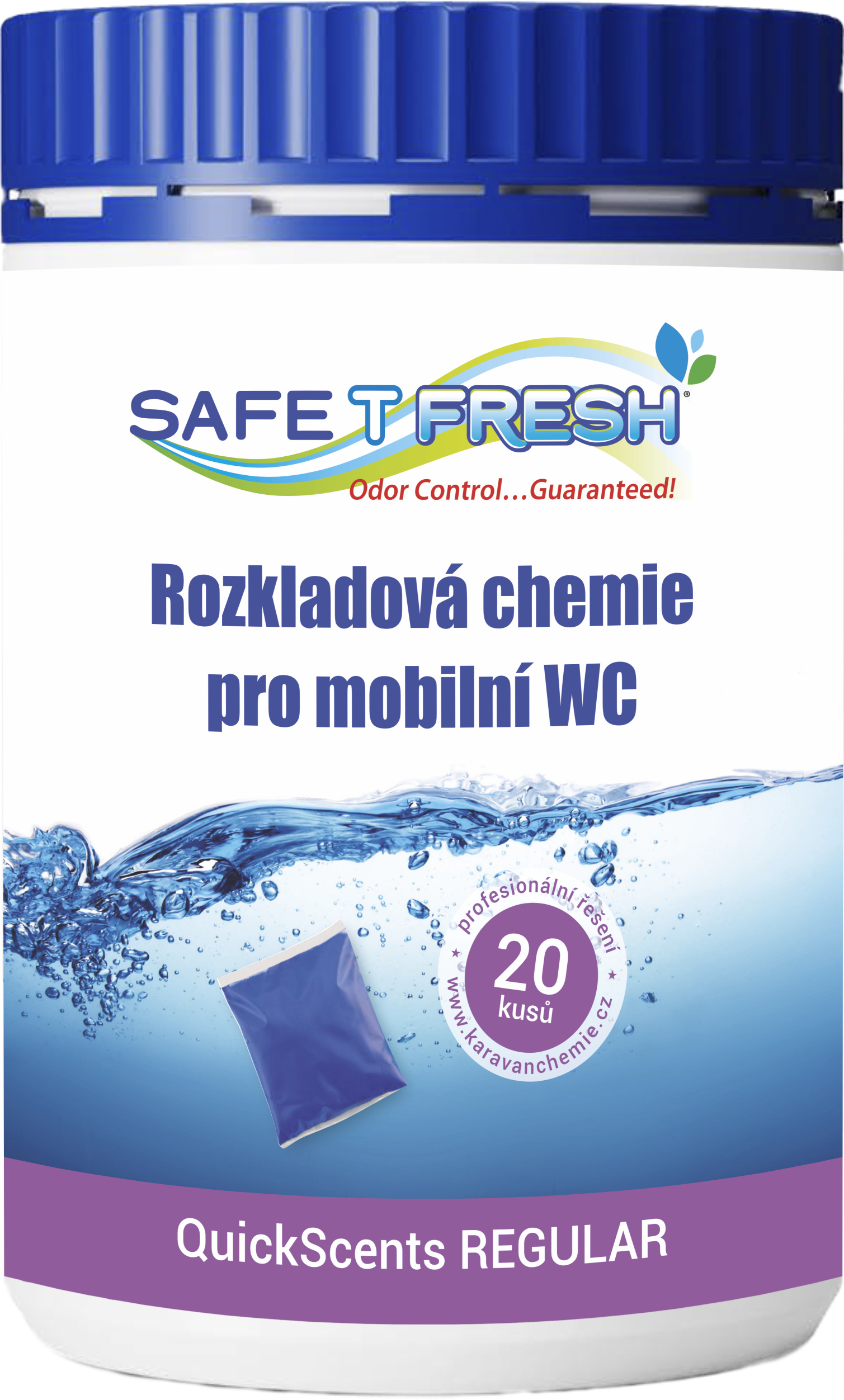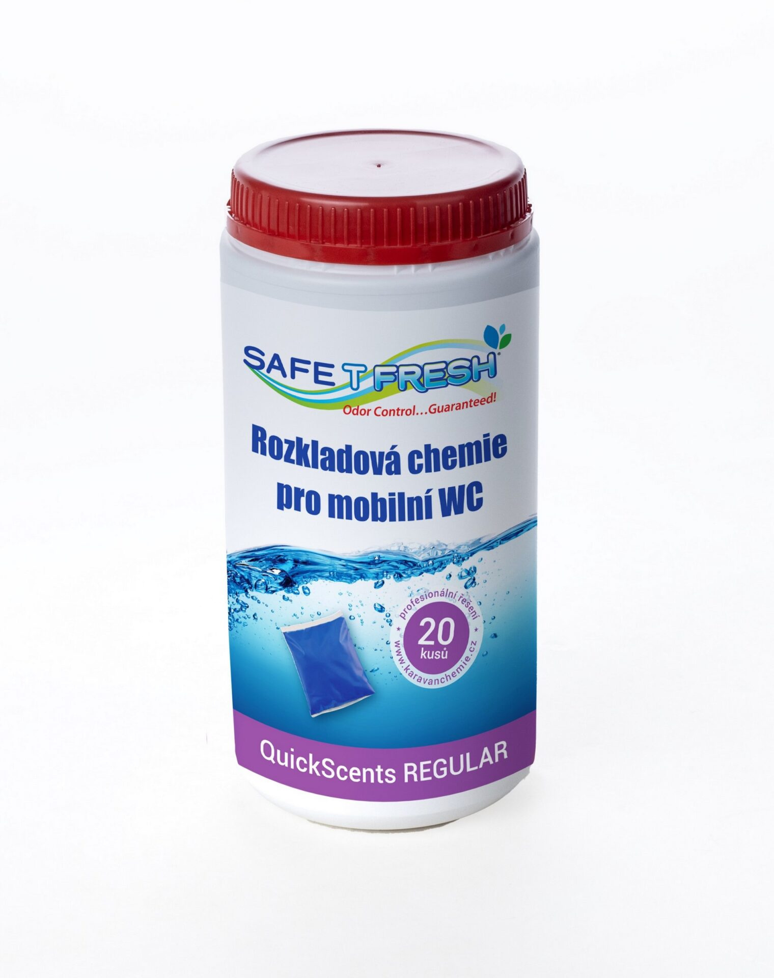Quick Scents Regular, ideální pro používání při vyšší teplotě pro denní údržbu vaší toalety. Speciální patentovaná chemická formule Triple Molecular Technology pro uvolňování biocidů v odstupňovaných intervalech zajišťuje rozklad fekálií, vynikající ochranu proti zápachu toalety v uzavřených prostorech, zabraňuje usazování nečistot na stěnách nádrže, vytváří dlouhotrvající modrou barvu. Náš jedinečný vnější film se rychle rozpouští v kombinaci s měkkým, vysokým nebo nízkým pH i tvrdou vodou. Při použití slané vody budou kapsle Safe-T-Fresh fungovat na vyšší úrovni. Neobsahuje formaldehyd.