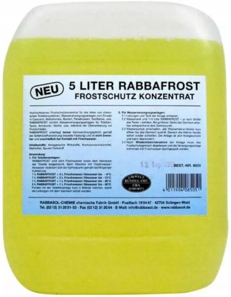 Rabbafrost je možno použít do splachovací i odpadní vody. Prostředek zřeďte čistou vodou dle návodu: 1l Rabbafrost + 3l vody - použitelné do -5° C 1l Rabbafrost + 2l vody - použitelné do -12° C 1l Rabbafrost + 1l vody - použitelné do -20° C 2l Rabbafrost + 3l vody - použitelné do -30° C