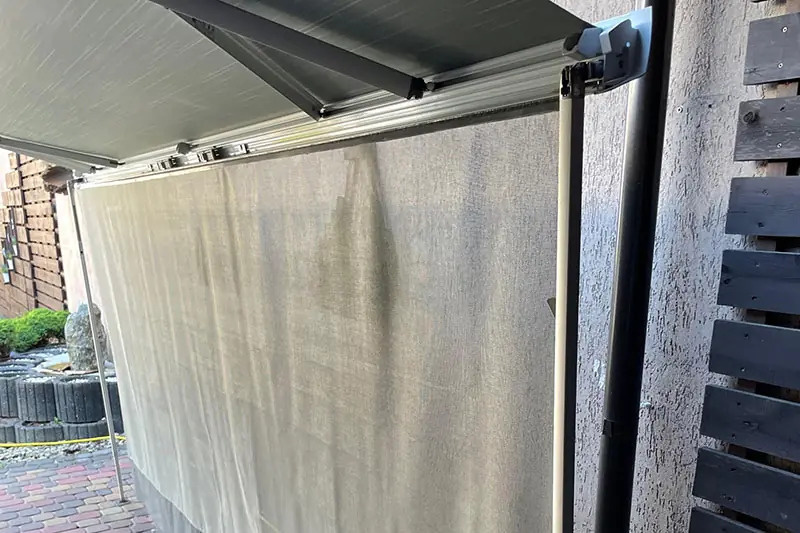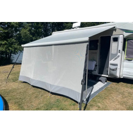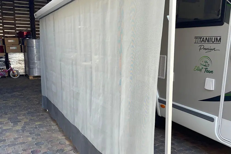Snadno instalovatelný přední zastínění. Je vyrobeno z prodyšné síťoviny. Materiál je odolný, vyrobený ze 100% polyvinylchloridu. Vršek potahu je vyztužený materiálem o gramáži 650 g/m2 a je uzpůsoben pro rychlou montáž do běžné markýzové lišty. Vhodné pro markýzy od výrobců, jako jsou: Thule, Fiamma, Dometic